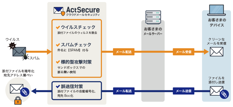 送信メールに添付されたファイルの自動暗号化、宛先BCC化、一時保留機能でうっかりミスによる情報漏えいを防止します。