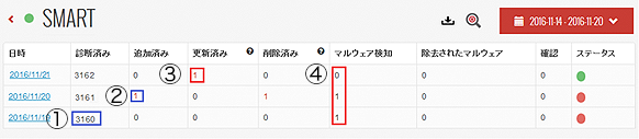 11/19の診断で、マルウェアを検知しています。SMART診断の設定において、自動駆除・削除の設定をしておけば、検知後すぐに処理されます。