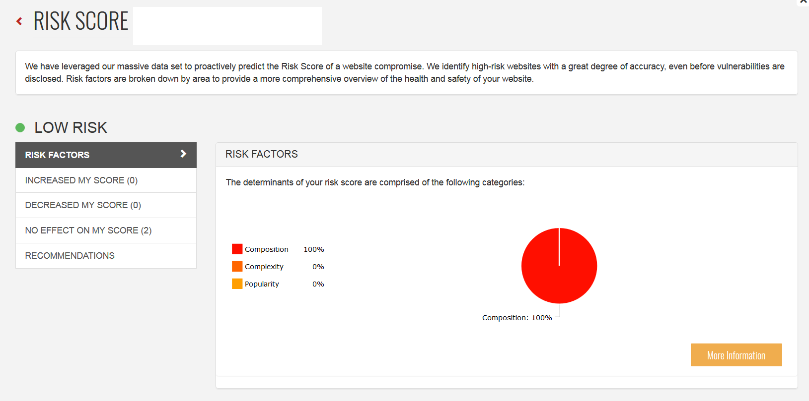 Webサイト改ざんのリスクを予測する機能です。SiteLockが収集・保有する膨大な量の診断データを元にWebサイトのリスクスコア(Risk Score)を決定し、「高」「中」「低」の3つのいずれかに分類されます。Webサイトに関する脆弱性が開示される前に改ざんリスクを判定できることから、Webサイトの危険性をわかりやすく把握できます。英語表示となります。