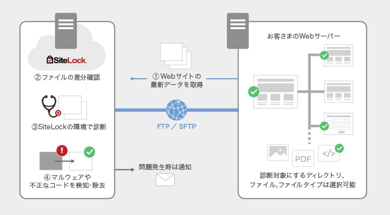 SiteLockは「SMART診断」のご利用を強く推奨しています。SMART診断では、SiteLockの診断サーバーがインターネット経由でお客さまのWebサーバーへアクセスします。そして、お客さまに予め登録いただいたFTP/SFTP/FTPSのアカウント情報(ID/パスワード)を利用して、Webサイトの最新データを取得いたします。(初回は診断対象に指定したデータすべて、次回以降は差分データのみ取得)