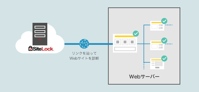 SiteLockの診断サーバーがインターネット経由で診断対象サイトにアクセスし、ページ内のリンクを辿る方式で定期的な診断を実施いたします。閲覧頻度の高いWebページ、お問い合わせフォーム、ショッピングカート、お申し込みフォームなど一般の訪問者がアクセスするコンテンツを中心に診断を実施可能です。