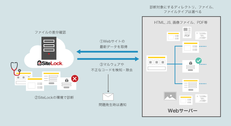 前述の診断と組み合わせて、SiteLockでは「SMART診断」のご利用を強く推奨しています。SMART診断では、SiteLockの診断サーバーがインターネット経由でお客さまのWebサーバーへアクセスします。そして、お客さまに予め登録いただいたFTP/SFTP/FTPSのアカウント情報(ID/パスワード)を利用して、Webサイトの最新データを取得いたします(初回は診断対象に指定したデータすべて、次回以降は差分データのみ取得)。